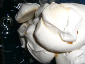 Disposez du papier sulfurisé sur une plaque à pâtisserie et à l’aide d’une cuillère à soupe faire des quenelles ou des tas. Il n’est pas nécessaire d’espacer les meringues outre mesure. Si vous avez une poche à douille vous pouvez l’utiliser pour former les meringues. Faites sécher les meringues dans un four préchauffé à 80°, environ 2h.