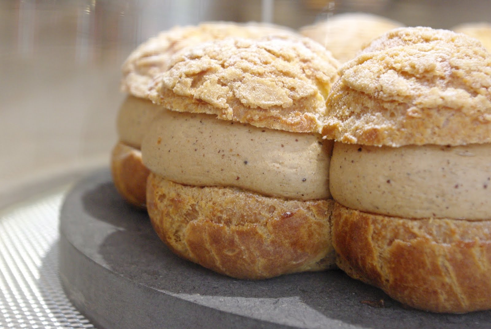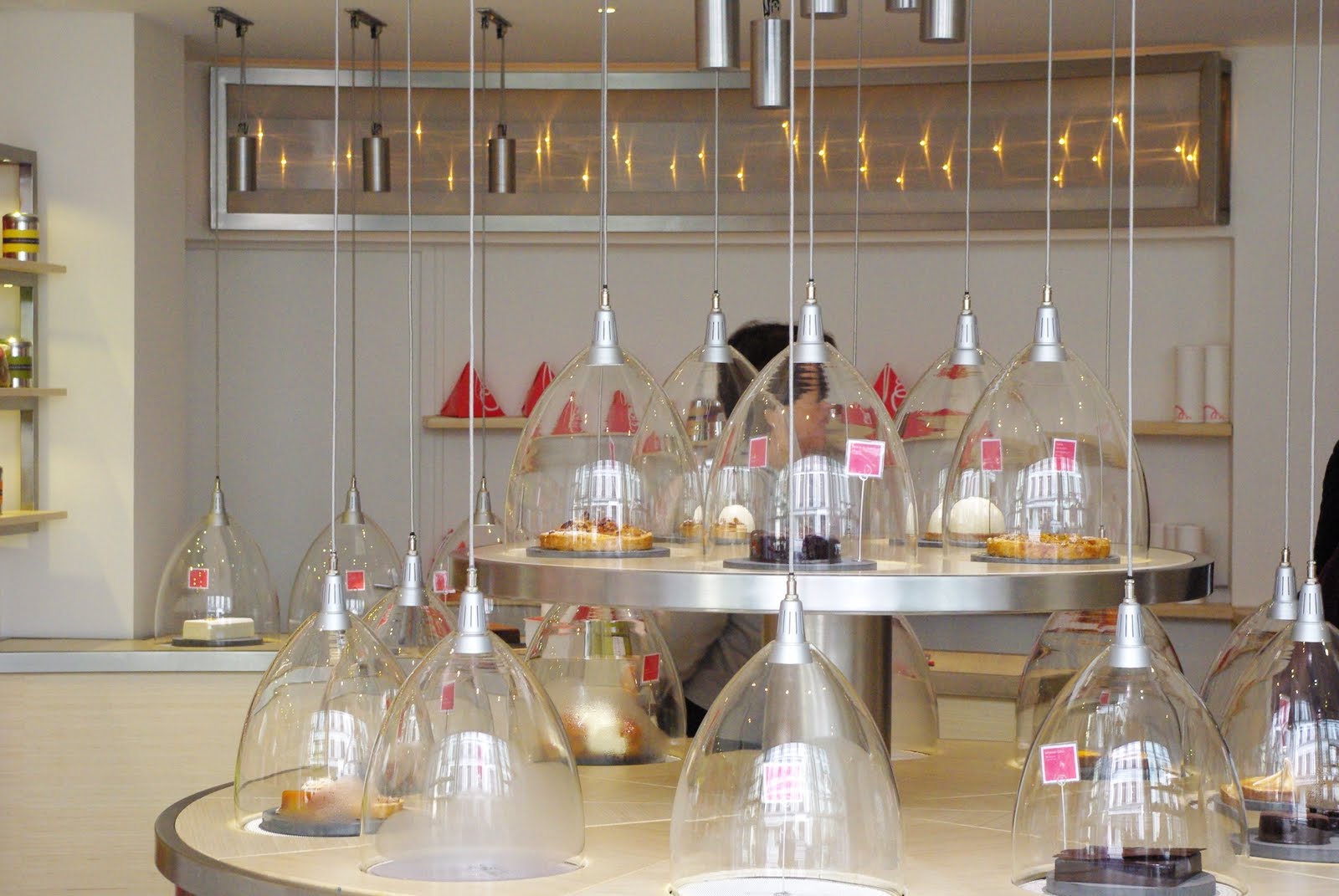 Passons donc aux choses sérieuses. La pâtisserie des rêves… Une paire de collants fushia tombe en arrêt devant la pâtisserie couleur taupe, hésite, repart puis cède à la tentation du moment. Tout est sous cloche lumineuse, le décor est épuré. Les vendeuses sont en robes blanches enfantines mais perchées sur talons aiguilles. Tout invite à la gourmandise.
