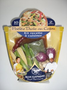 Juste à l’angle gauche, bien caché sous un sachet de salade iceberg, un petit paquet coloré attire mon attention… Trois maïs nains, deux échalotes fushia, un beau piment rouge, quelques noix de cajou et des sachets de sauce et d’herbes séchées… Ah ça par exemple, voilà quelque chose de peu commun me dis-je. Je dégaine les lunettes et je lis : « Poêlée thaï au cajou, Kit recette à cuisiner. 10 minutes. 2 personnes ». Puis la marque « Blue Elephant Royal Thai Cuisine », inconnue au bataillon. Bon, la date d’expiration est presque à son terme, ça ne doit pas marcher du tonnerre comme produit mais les petites échalotes me font déjà de l’oeil : vendu.