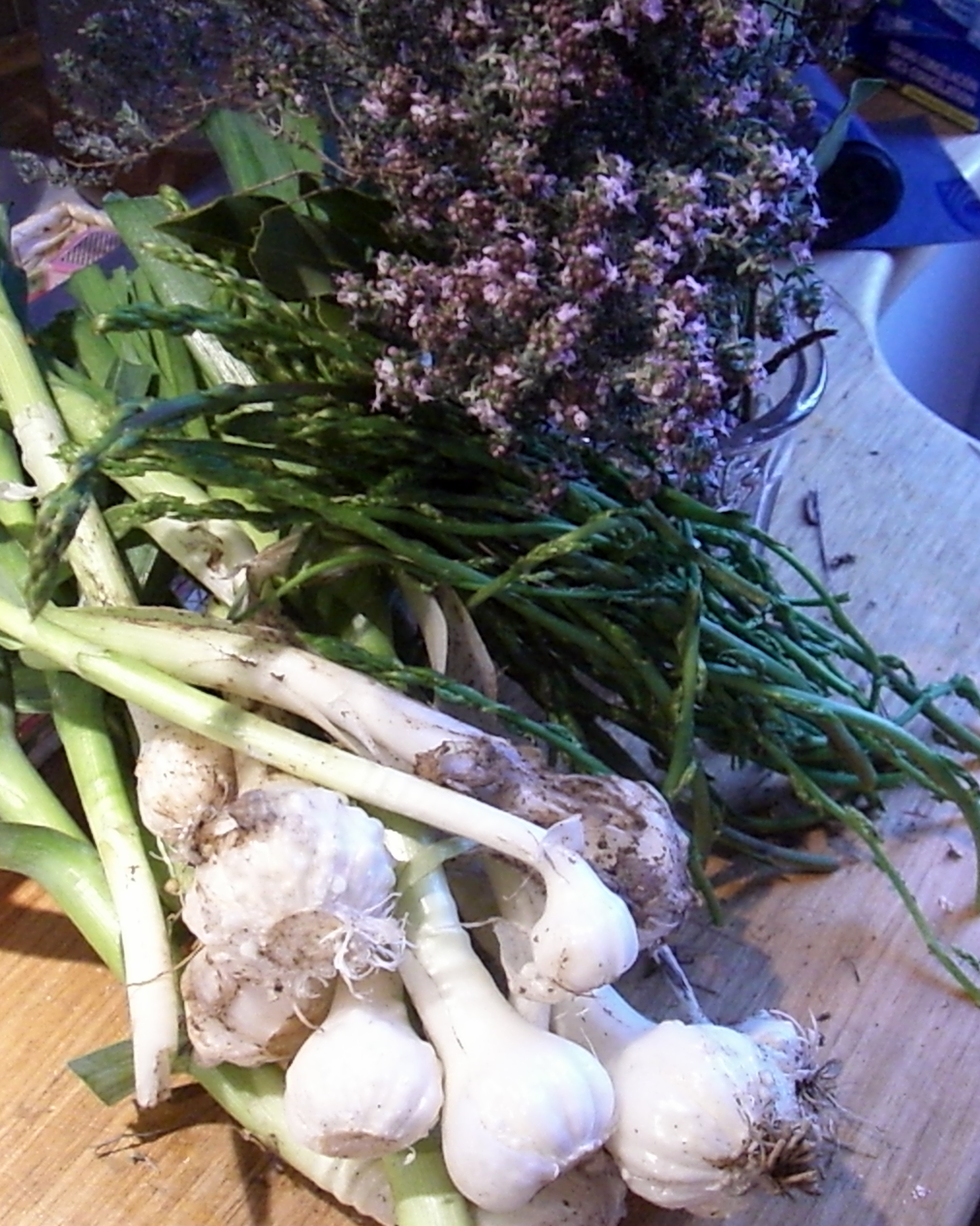 Quoi de mieux qu’une petite après-midi passée à herboriser pour redonner un peu de  sauvagerie aux deux rats des villes que nous sommes ? Quel plaisir de rentrer le soir à la maison avec quelques asperges et poireaux sauvages, un beau bouquet de thym en fleur pour respirer toute la semaine l’odeur des collines ! L’occasion d’une leçon de choses et un bon prétexte à un gueuleton fameux. Recette inside…