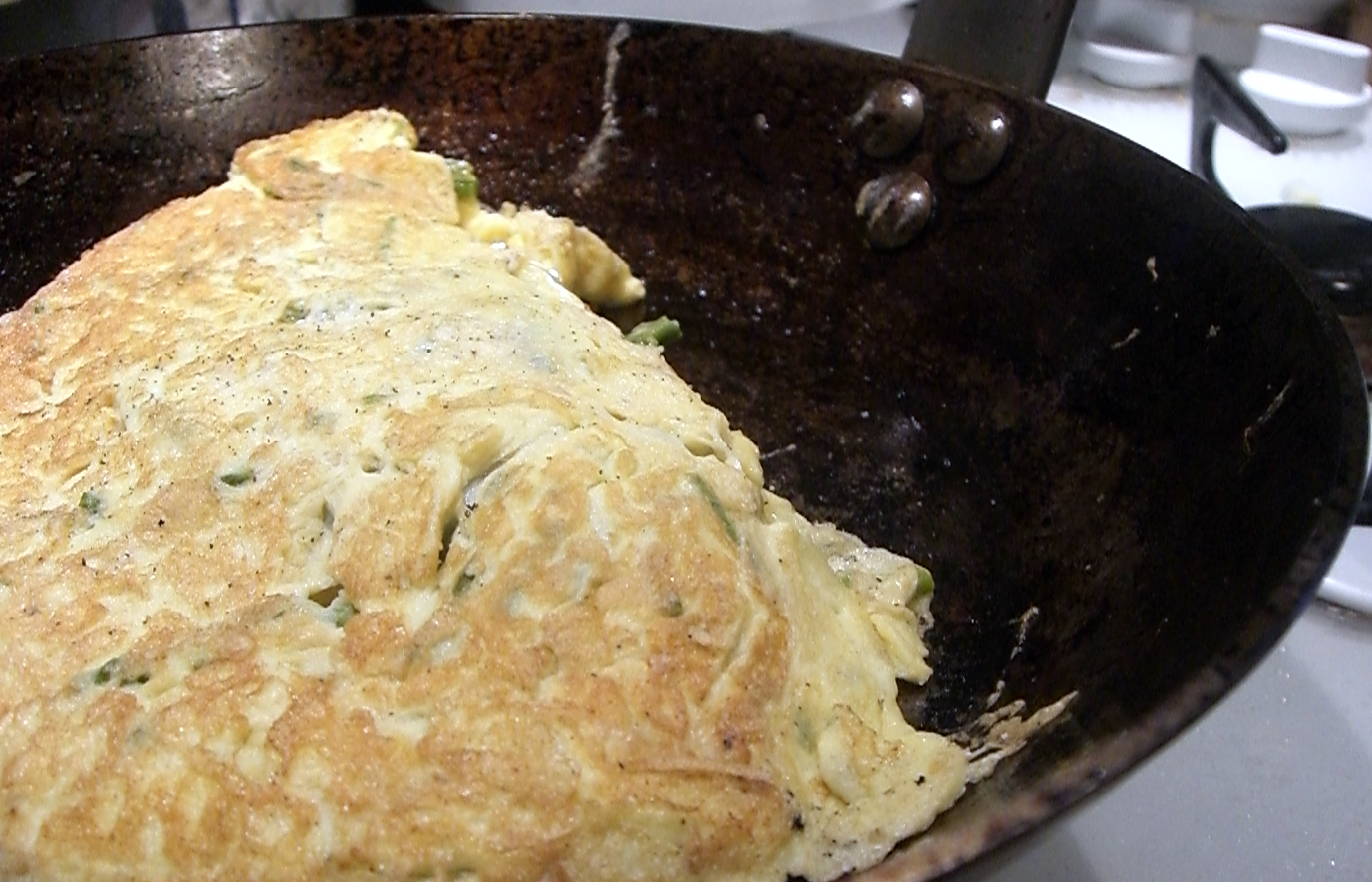 Pochez les asperges dans un bon bouillon maison et réalisez une omelette que vous fermerez comme un calzone afin qu’elle reste crémeuse à l’intérieur. Pour mémoire : une omelette est constituée d’oeufs, d’une pincée de sel et de poivre ainsi que d’une garniture variée (légumes, pâtes, lardons, viande etc. En fonction de vos arrivages) et n’oubliez pas de graisser la poêle et de la faire chauffer avant d’ajouter vos œufs battus.
