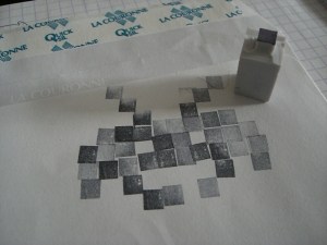 1. @ La papote : j’ai retrouvé une vieille boîte d’encre à tampon noire… Echouée on ne sait comment de l’époque où j’allais au bureau de mes parents pour tamponner à tout va ! Mais on peut utiliser aussi la méthode du coloriage. Avec de l’encre pour tissu par exemple 😉 ça ouvre des possibilités ! En fait je fais avec les moyens du bord.