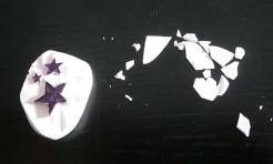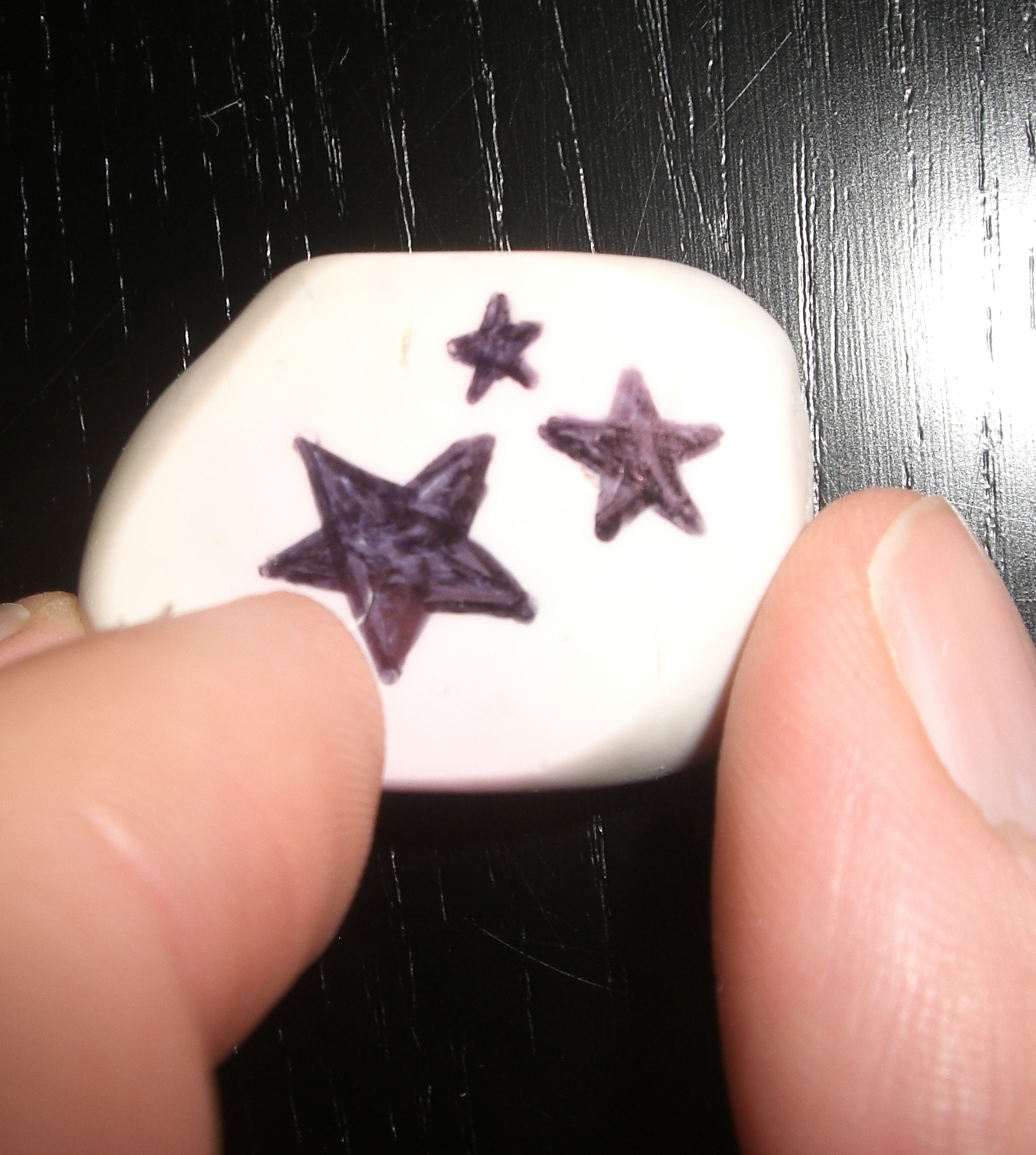 Commencez par nettoyer la gomme si nécéssaire avec l’essence F ou votre savon. Rincez et séchez. Dessinez à main levée le motif de votre choix (plus le dessin présente des courbes et des détails plus il vous sera difficile d’évider la gomme). Je vous recommande de commencer par une belle étoile bien au centre de la gomme.