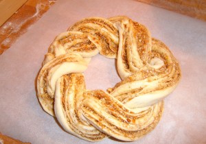 Abaissez la pâte en rectangle sur le plan de travail fariné (après l’avoir dégazée) sur une épaisseur de quelques millimètres. Étalez la garniture sur la pâte  puis confectionnez soigneusement un rouleau que vous couperez ensuite sur toute la longueur (les étapes sont très bien expliquées en photo chez Iza, je vous invite à vous y rendre).