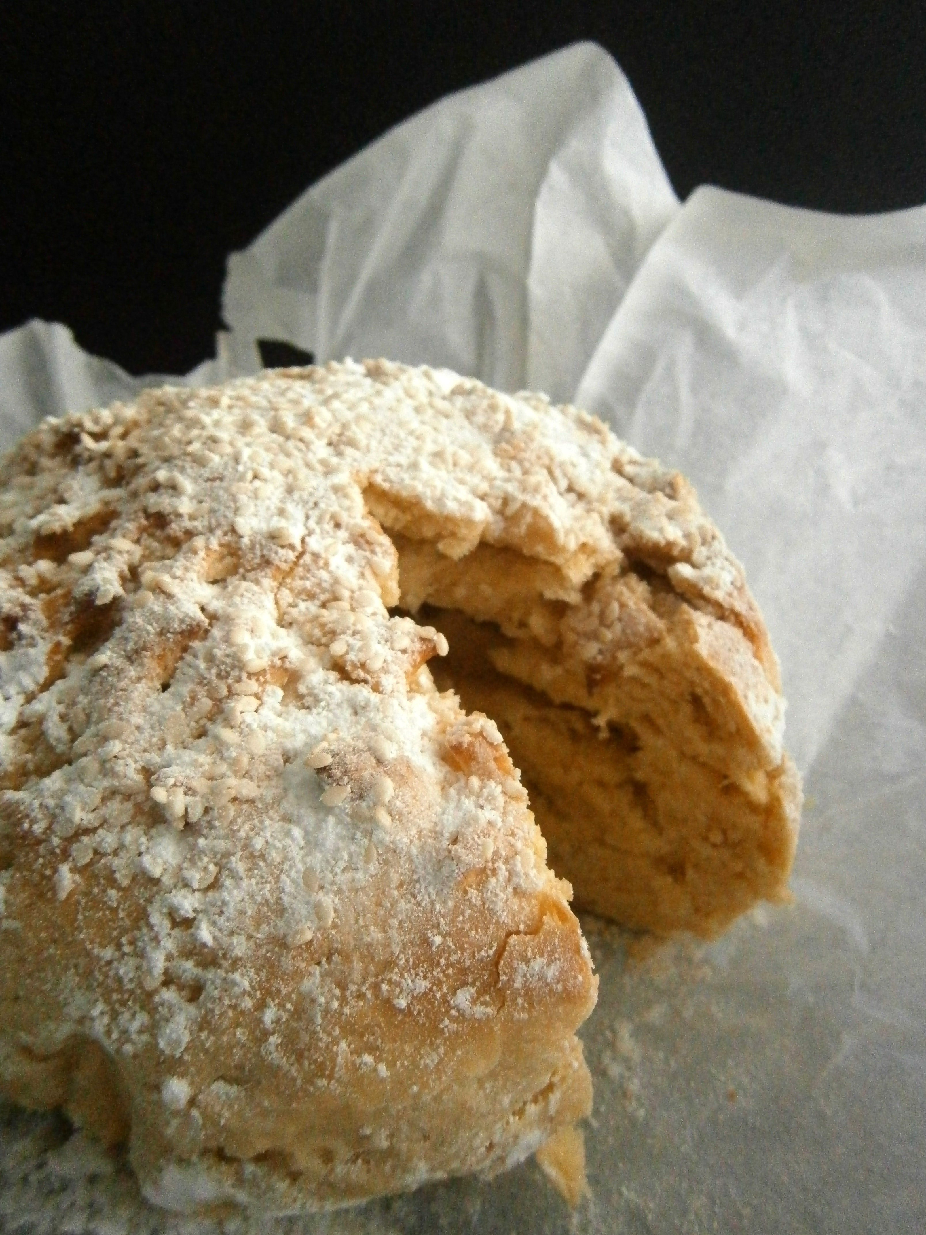 Chemisez un moule rond à bords hauts ou des petits moules à muffins pour des brioches individuelles. Dégazez la pâte, formez une ou des boules et placez-les dans le ou les moules. Laissez lever 2 heures ou jusqu’à ce que la pâte ait doublé de volume. Badigeonnez d’eau, faites une jolie grigne (au cutter, aux ciseaux ou à la lame de rasoir) puis ajoutez des graines de sésame et du sucre glace.