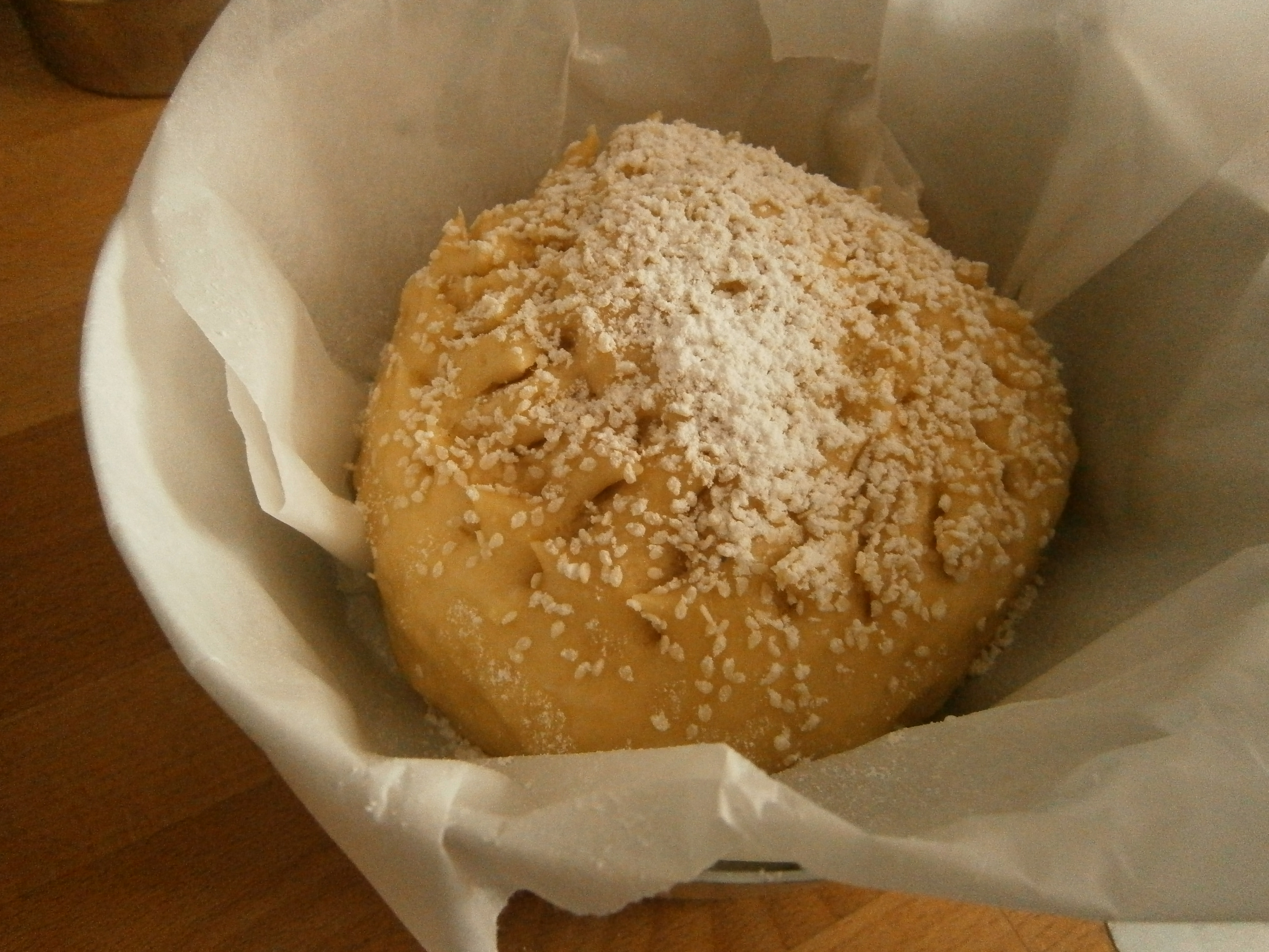 Faire une boule avec cette pâte (la pâte est lourde, légèrement collante mais assez facile à travailler en fait). Et laissez-la lever deux heures ou jusqu’à ce que la pâte ait doublé de volume. (Vous pouvez également à ce stade la placer une nuit au frigo pour laisser les arômes se développer).