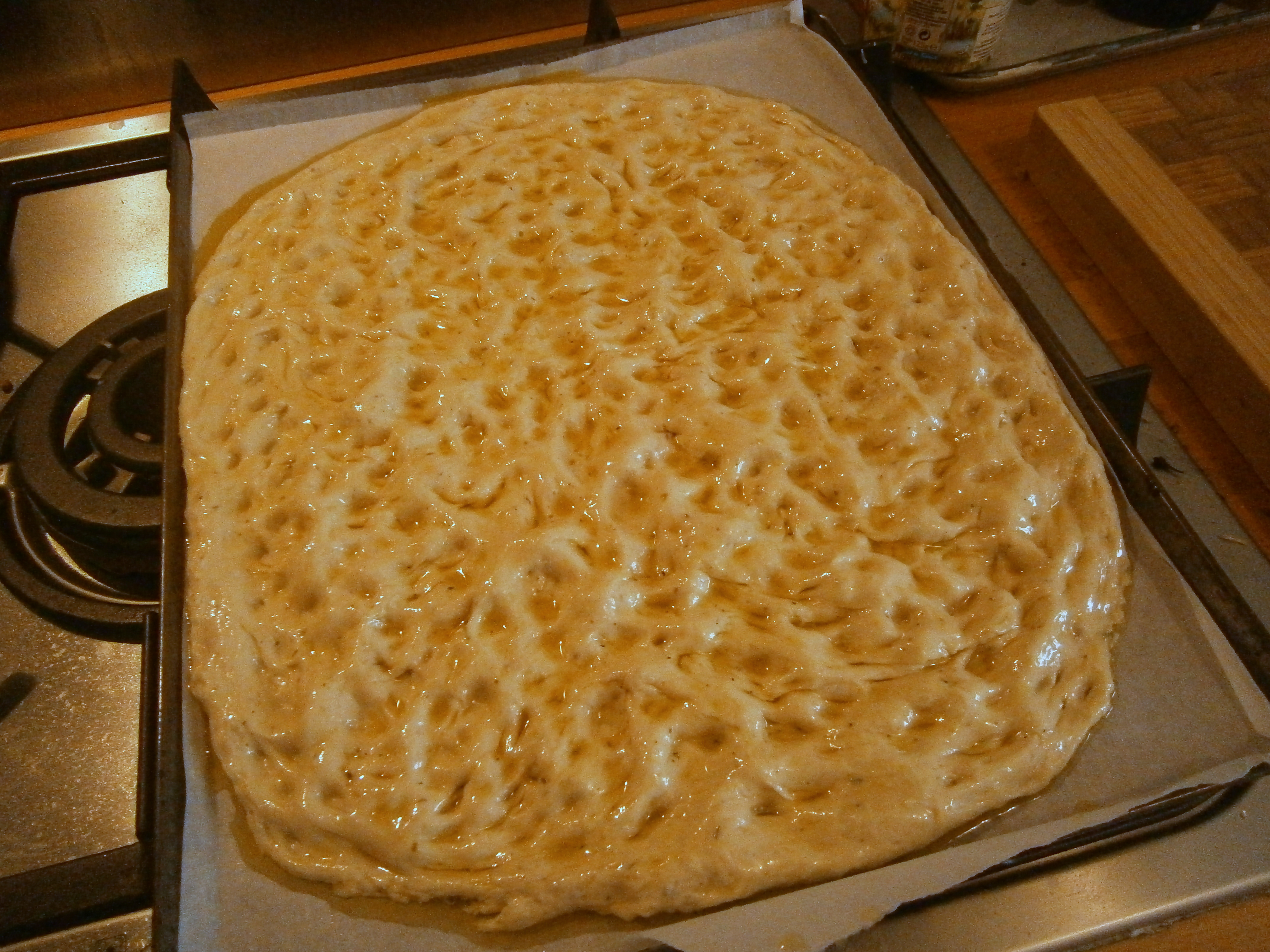 Disposez une feuille de papier cuisson sur une plaque à pâtisserie, huilez-la. Dégazez la pâte puis placez-la sur la plaque puis huilez vos doigts. Du bout des doigts, faites des trous dans la pâte afin de l’étaler le plus possible et d’une épaisseur égale sur la pâte. Ajoutez ensuite tout le reste de l’huile sur la plaque de pâte, laissez lever une demi heure puis parsemez d’origan et de romarin haché.