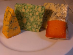 Vous trouverez sur ce plateau british, de gauche à droite, : du Shropshire blue cheese, du Derby Sage, du bleu de Stilton et du Cheddar village.