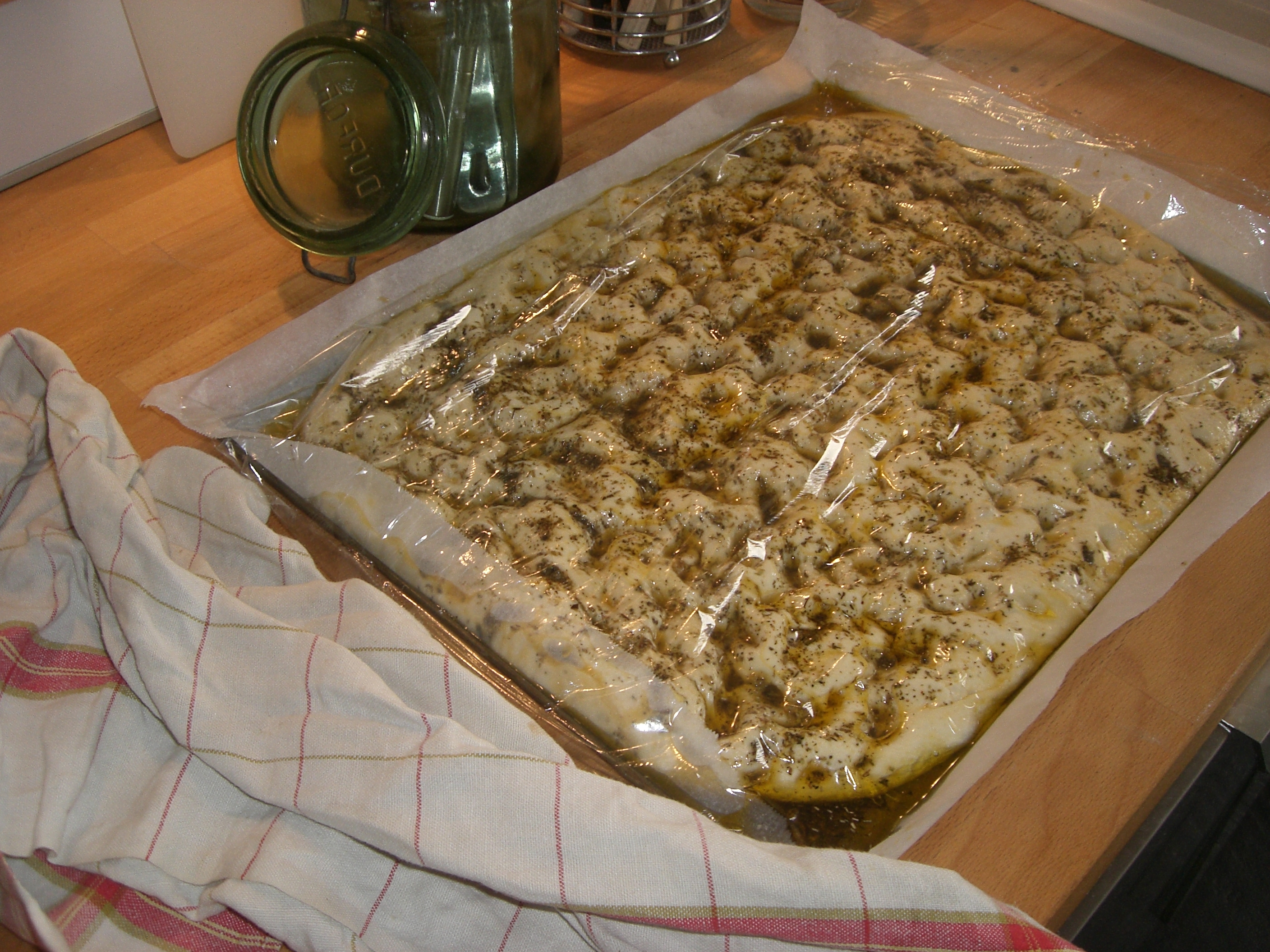 8. Sortez la plaque du frigo trois heures avant la cuisson. Répandez éventuellement le reste de l’huile aux herbes sur la surface et faites-la pénétrer en creusant des fossettes, toujours à l’aide du bout des doigts (vous pouvez utiliser toute l’huile ; la pâte va l’absorber, même si la quantité vous semble pour l’instant importante), ce qui va vous permettre d’étaler complètement la pâte sur la plaque sur une épaisseur d’un centimètre à un centimètre et demi. Couvrez à nouveau la plaque avec du plastique et laissez lever la pâte à température ambiante pour trois heures (ou jusqu’à ce qu’elle ait doublé de volume et atteint une épaisseur d’environ 2 centimètres et demi).