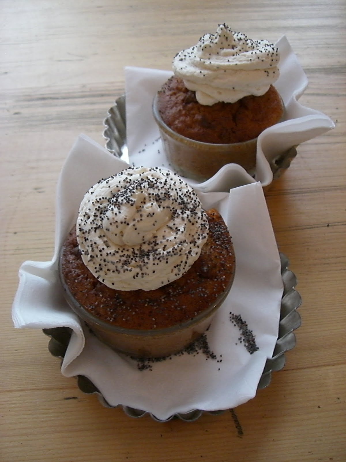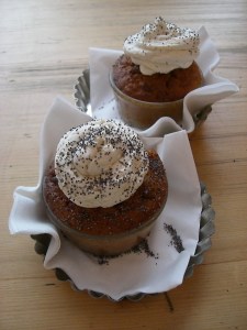 A cette époque les gâteaux étaient souvent cuits dans de petits ramequins de terre cuite, de la taille d’une tasse de thé, lorsque la tasse de thé n’était pas directement utilisée comme moule ! Puis le muffin tin, une timbale de fer remplace les tasses de faïence, avant d’être supplanté lui aussi aujourd’hui par les moules en silicone.